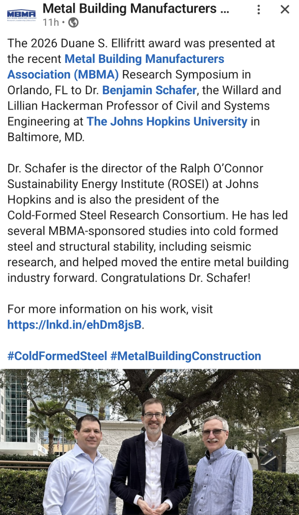 Congratulations to Dr. Ben Schafer for winning the Metal Building Manufacturer's Association (MBMA) Duane S. Ellifritt Award! Ben is a Principal Investigator for our FastFloor research efforts (currently RGA 1-25).